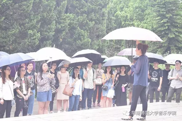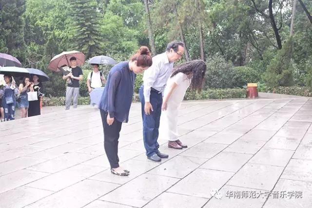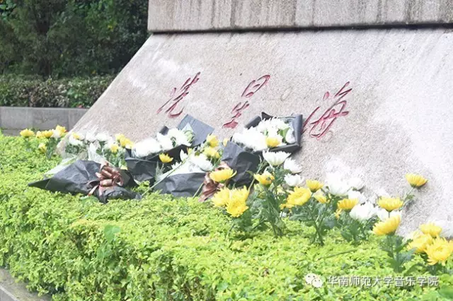 绵绵细雨阻挡不了大家内心的激动,顺着阶梯来到了冼星海墓碑前举行献花仪式,在场师生深切缅怀革命先烈冼星海