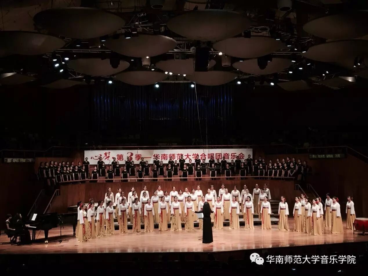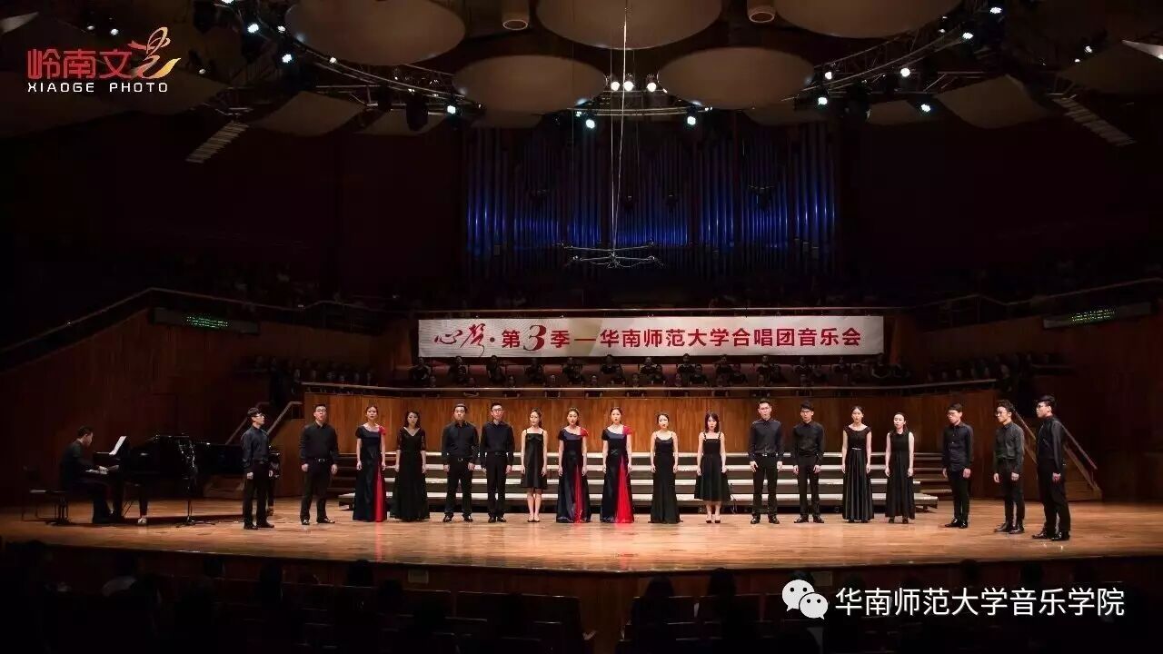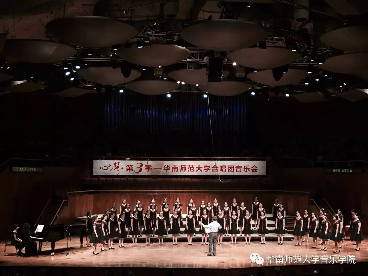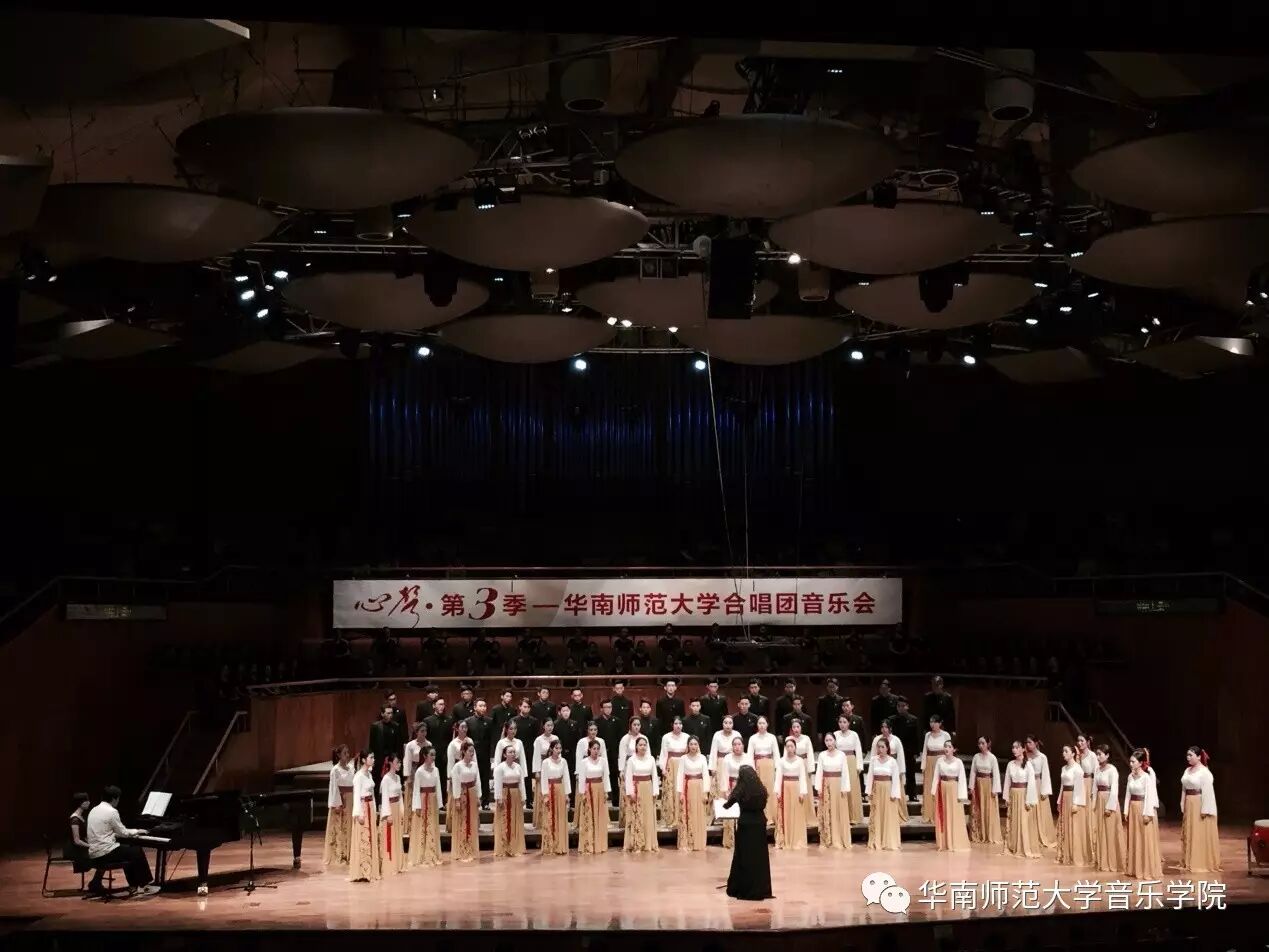 2017年4月29日晚,华南师范大学合唱团“心声”第三季音乐会在广东省星海音乐厅成功举办。本季音乐会也为期四天的“2017中国合唱新作品创作推广研讨会暨合唱指挥研修班”的总结和落幕,华南师范大学合唱团用这样一场以新作品为主的音乐会,表达我们对合唱新作品的渴望,并唤醒社会对音乐艺术创作的尊重。华南师范大学合唱团“心声”音乐会从2014年走到现在已有三个年头,每一季度的音乐会都带给听众心灵的震撼。 华南师范大学合唱团女声合唱团自成立以来,受到国内外合唱界的好评,成为广东大学生合唱团队的佼佼者,更是广东省大型合唱艺术活动的主力军。 音乐会以星海音乐学院房晓敏教授改编的女声合唱《我像雪花天上来》开场,分为上、下半场进行。在苏严惠老师的指导下,华南师范大学合唱团女声合唱团首先为听众们带来由本院郭和初教授改编的粤语童谣《月光光》和许新华教授改编的曲江民歌《落水天》,丰富的和声及广东音乐的特色带给听众无限的亲切感。接下来,女声合唱团为大家带来吉林大学珠海学院音乐舞蹈学院夏炎彬老师的原创作品——《苏幕遮·怀旧》,该曲由华南师范大学合唱团女声合唱团于2015年在欧洲首演。