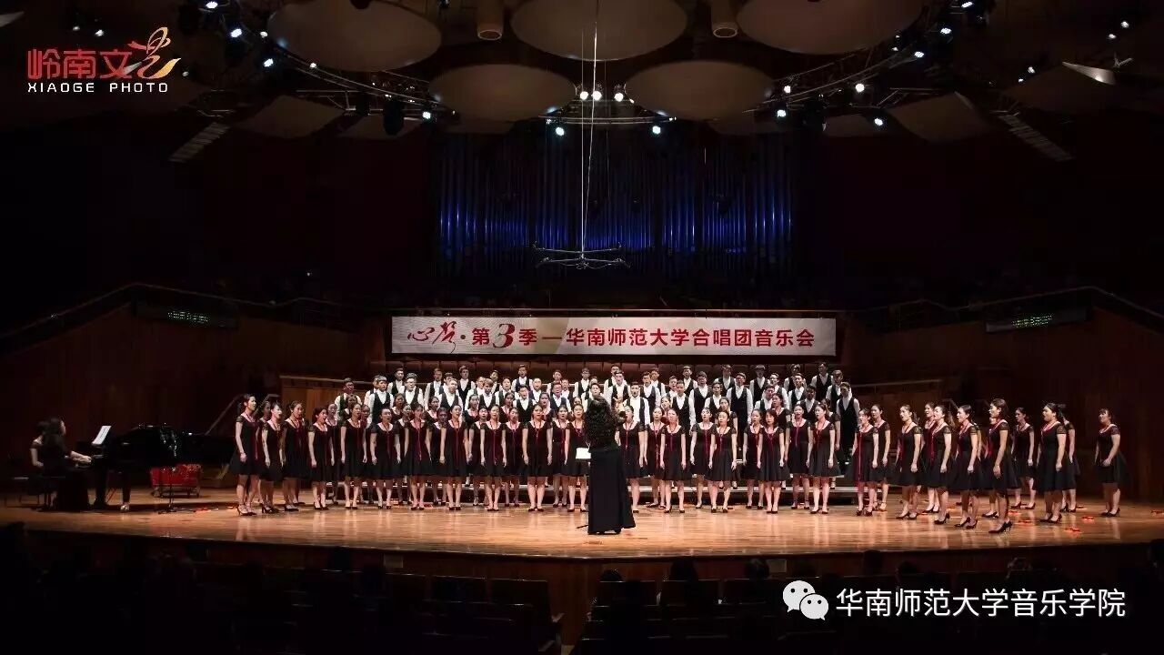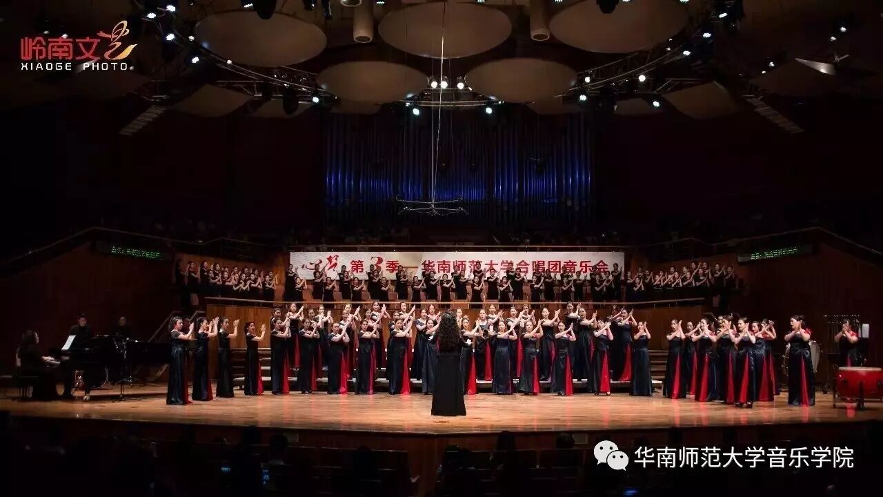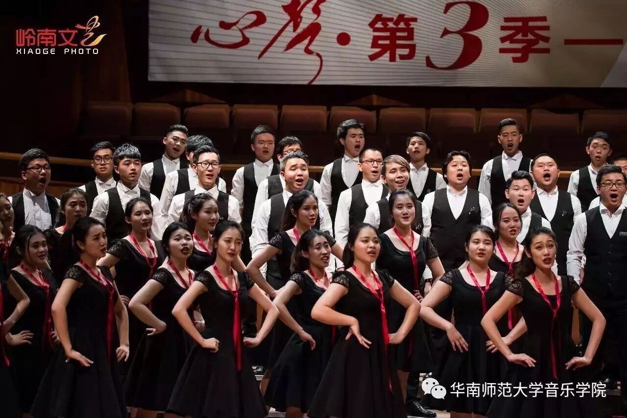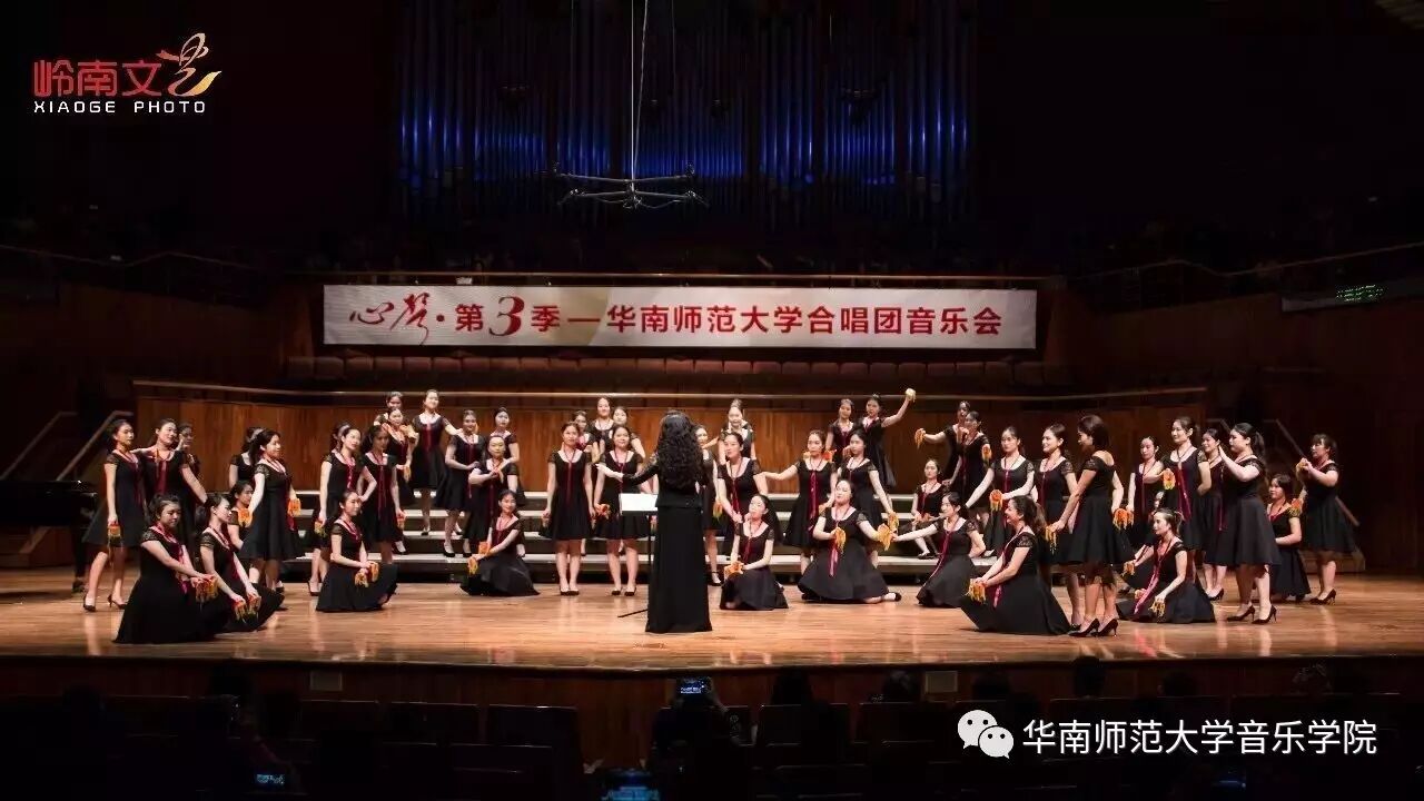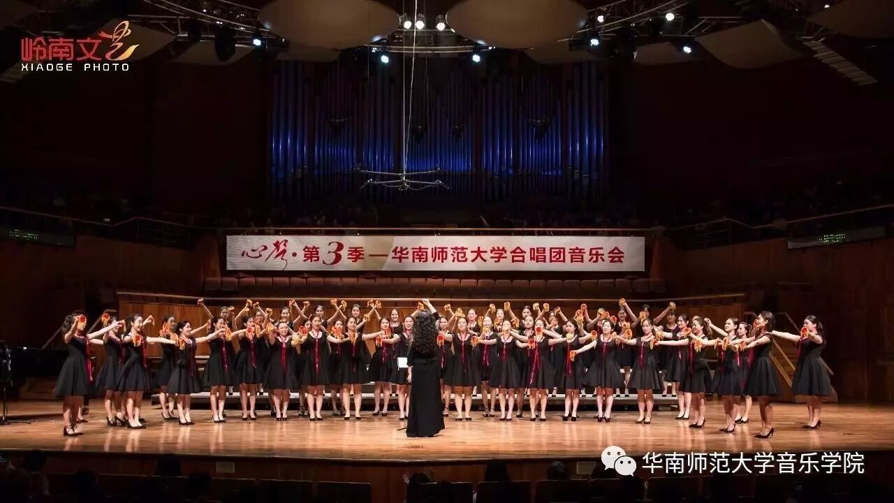 2017年4月29日晚,华南师范大学合唱团“心声”第三季音乐会在广东省星海音乐厅成功举办。本季音乐会也为期四天的“2017中国合唱新作品创作推广研讨会暨合唱指挥研修班”的总结和落幕,华南师范大学合唱团用这样一场以新作品为主的音乐会,表达我们对合唱新作品的渴望,并唤醒社会对音乐艺术创作的尊重。华南师范大学合唱团“心声”音乐会从2014年走到现在已有三个年头,每一季度的音乐会都带给听众心灵的震撼。 华南师范大学合唱团女声合唱团自成立以来,受到国内外合唱界的好评,成为广东大学生合唱团队的佼佼者,更是广东省大型合唱艺术活动的主力军。 音乐会以星海音乐学院房晓敏教授改编的女声合唱《我像雪花天上来》开场,分为上、下半场进行。在苏严惠老师的指导下,华南师范大学合唱团女声合唱团首先为听众们带来由本院郭和初教授改编的粤语童谣《月光光》和许新华教授改编的曲江民歌《落水天》,丰富的和声及广东音乐的特色带给听众无限的亲切感。接下来,女声合唱团为大家带来吉林大学珠海学院音乐舞蹈学院夏炎彬老师的原创作品——《苏幕遮·怀旧》,该曲由华南师范大学合唱团女声合唱团于2015年在欧洲首演。