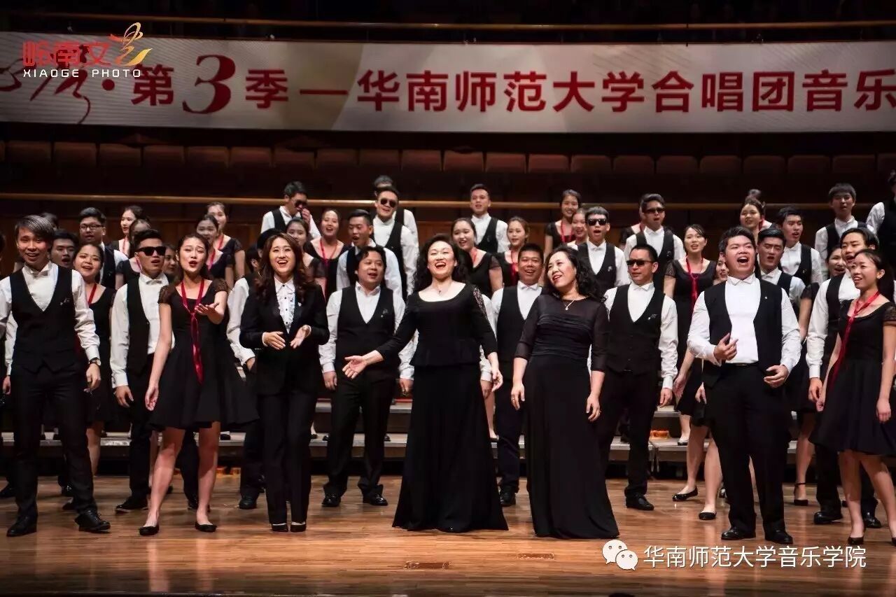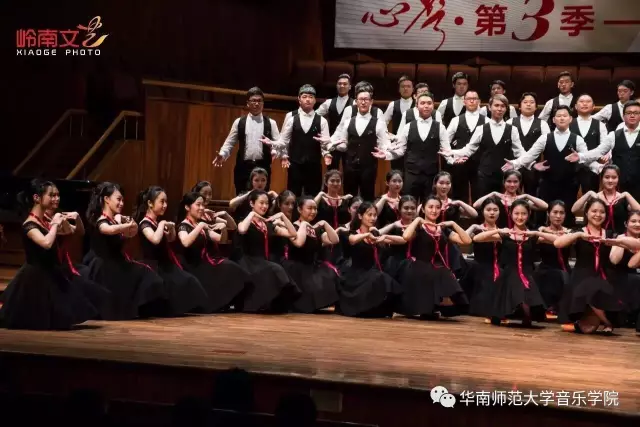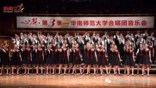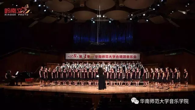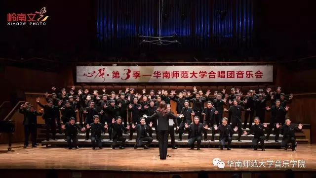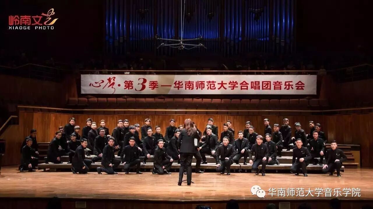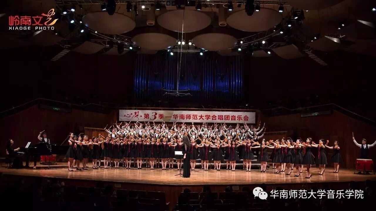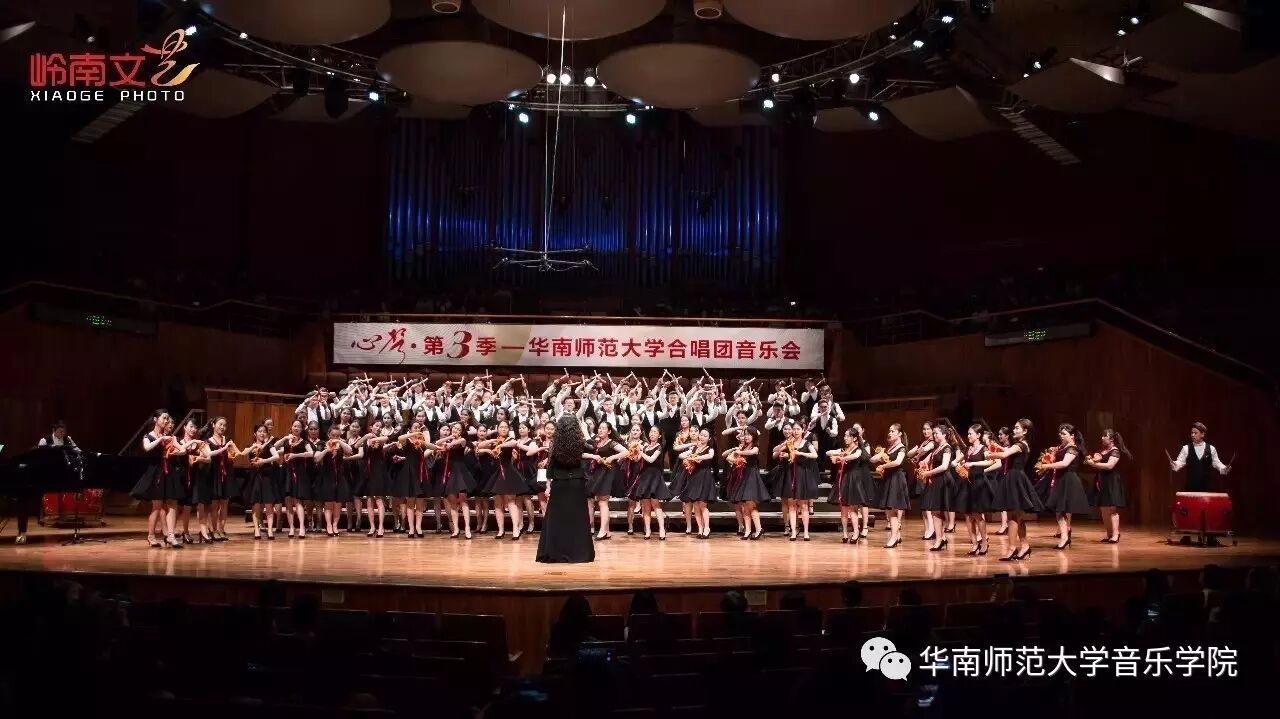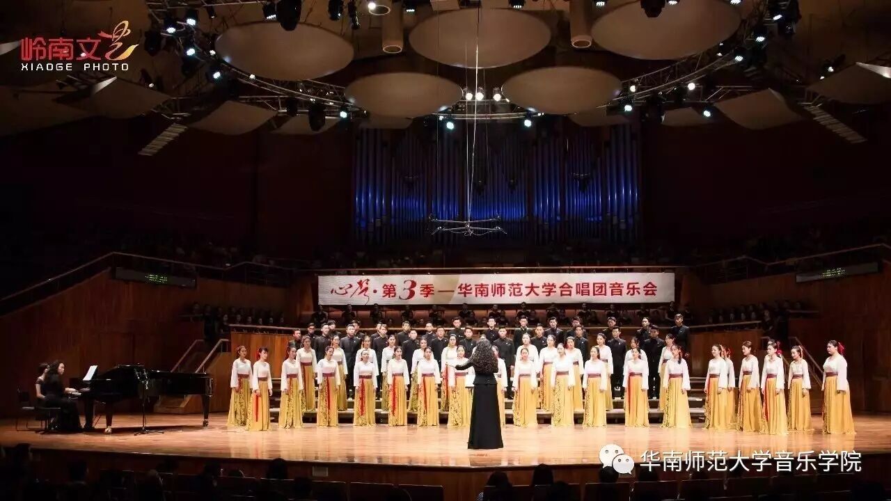 2017年4月29日晚,华南师范大学合唱团“心声”第三季音乐会在广东省星海音乐厅成功举办。本季音乐会也为期四天的“2017中国合唱新作品创作推广研讨会暨合唱指挥研修班”的总结和落幕,华南师范大学合唱团用这样一场以新作品为主的音乐会,表达我们对合唱新作品的渴望,并唤醒社会对音乐艺术创作的尊重。华南师范大学合唱团“心声”音乐会从2014年走到现在已有三个年头,每一季度的音乐会都带给听众心灵的震撼。 华南师范大学合唱团女声合唱团自成立以来,受到国内外合唱界的好评,成为广东大学生合唱团队的佼佼者,更是广东省大型合唱艺术活动的主力军。 音乐会以星海音乐学院房晓敏教授改编的女声合唱《我像雪花天上来》开场,分为上、下半场进行。在苏严惠老师的指导下,华南师范大学合唱团女声合唱团首先为听众们带来由本院郭和初教授改编的粤语童谣《月光光》和许新华教授改编的曲江民歌《落水天》,丰富的和声及广东音乐的特色带给听众无限的亲切感。接下来,女声合唱团为大家带来吉林大学珠海学院音乐舞蹈学院夏炎彬老师的原创作品——《苏幕遮·怀旧》,该曲由华南师范大学合唱团女声合唱团于2015年在欧洲首演。